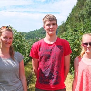 Mari, Pål Andreas og Oda Kolås er mellom anna med på å plukke bringebær.