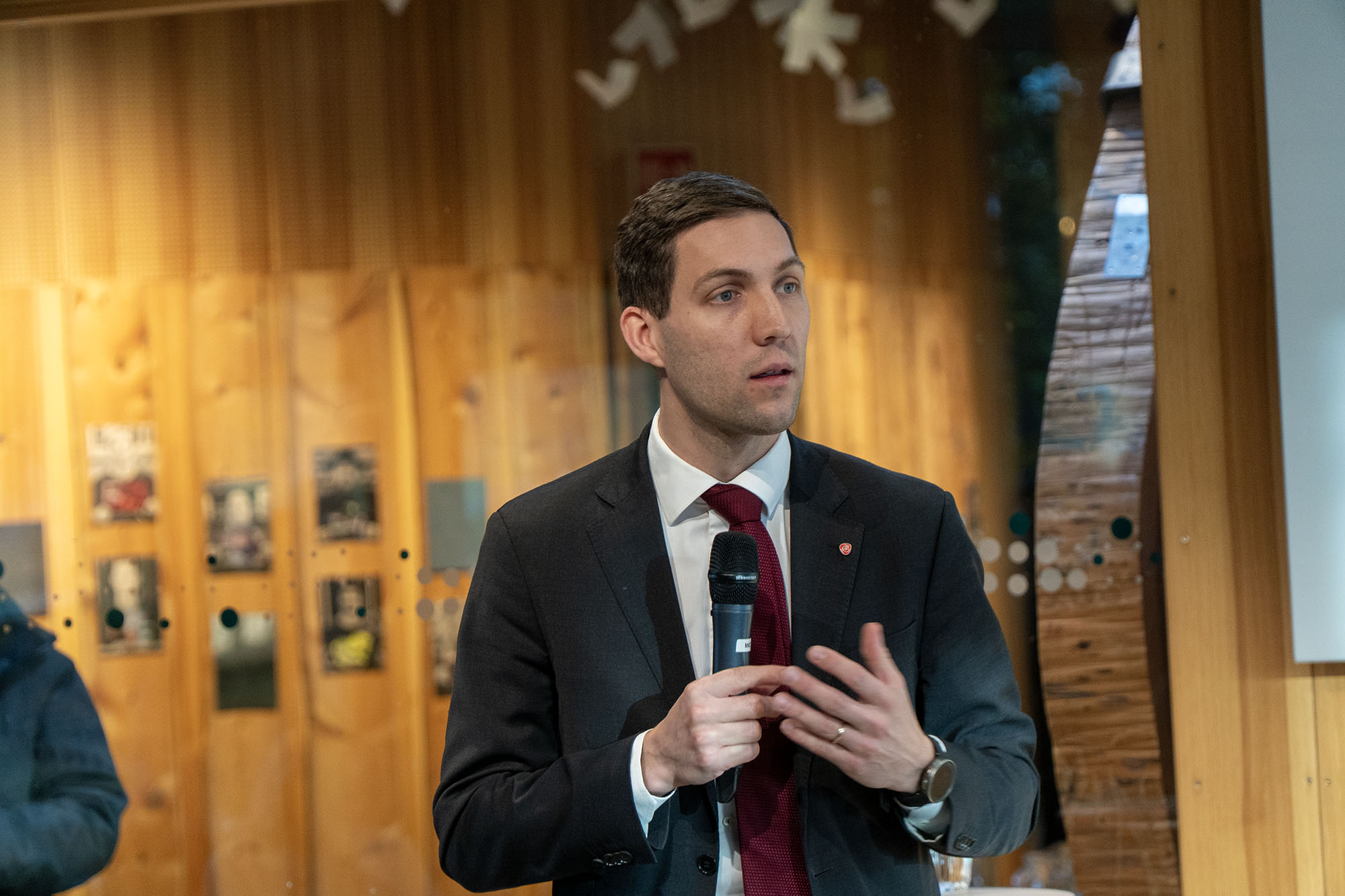 Klima- og miljøminister Andreas Bjelland Eriksen snakka til dei frammøtte på Klimahuset i forkant av COP30. Han understreka at alt vi klarar å kutte er med på å redde liv og sørge for at planeten vår er mogleg å bu på i framtida. – Og det er eg oppteken av, ikkje berre for mine eigne ungar. Eg er 33 år, og i 2050 er eg 58. Eg har tenkt å henge rundt, sa Eriksen til latter frå salen. Foto: Birgitte Vågnes Bakken