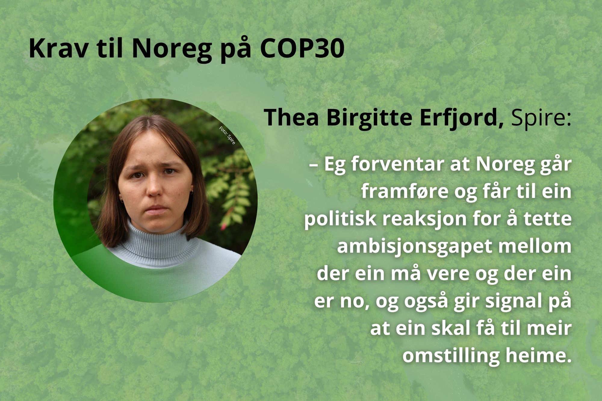 I 2025 skal alle landa levere nye nasjonale klimamål, kalla NDC-ar (Nationally Determined Contributions). Desse klimaplanane er ikkje eit forhandlingstema under klimatoppmøtet, men Thea Birgitte Erfjord i Spire meiner dei likevel blir noko av det viktigaste i Brasil.