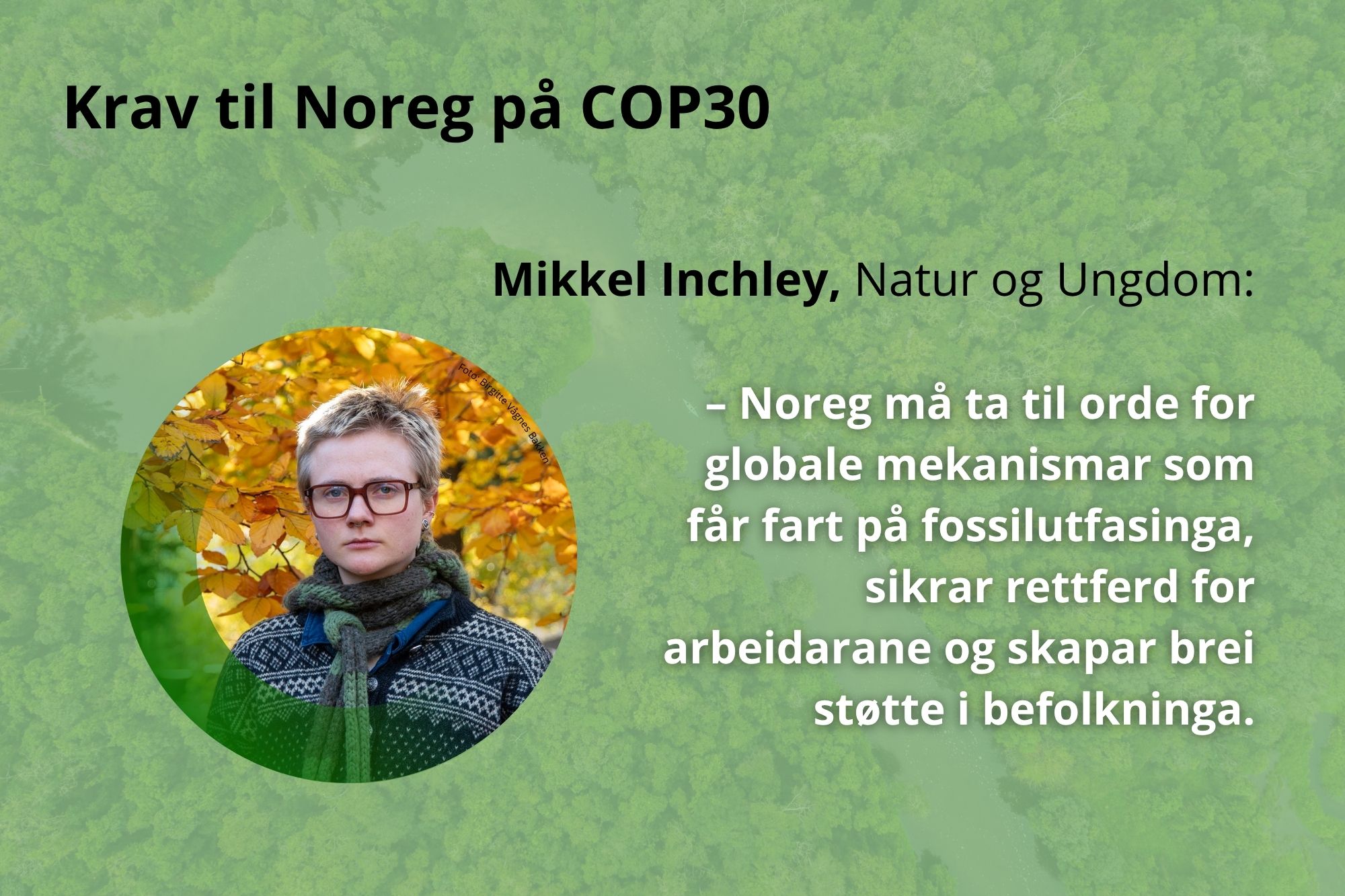 Under COP28, vart partane samde om ei omstilling bort frå fossil energi. Mikkel Inchley i Natur og Ungdom er oppteken av at omstillinga må skje utan at det fører til auka forskjellar mellom folk, eller set arbeidstakarar i fare. Han trekker fram at mange arbeidarar vil trenge nye jobbar når ein sluttar å leite etter olje og gass, samstundes som ein ny, grøn industri krev ny kompetanse.