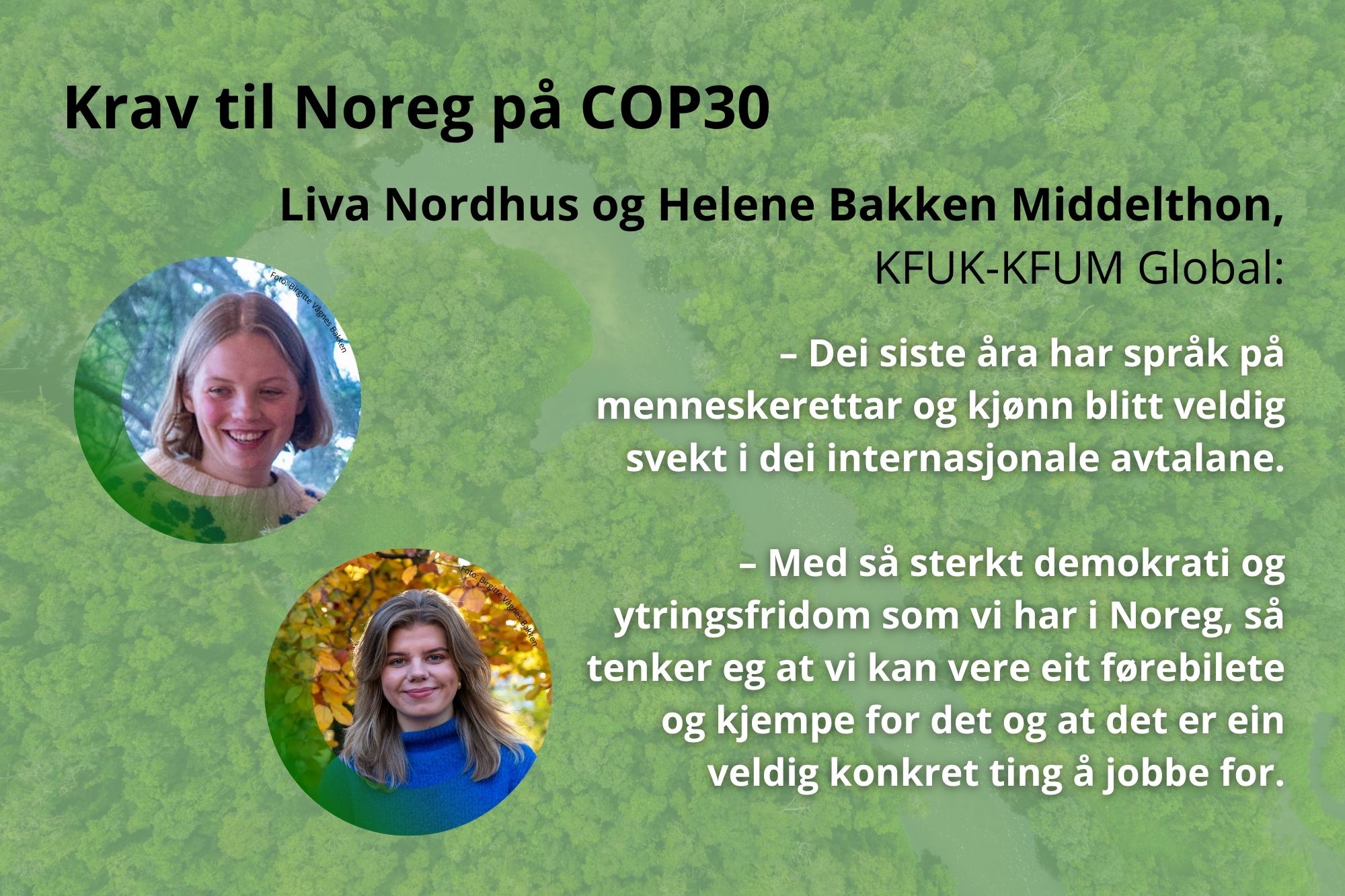 Helene Bakken Middelthon (23), som er med i same organisasjon, trekker fram at menneskerettar ikkje blei prioritert i fjor, då klimatoppmøtet var i Baku i Aserbajdsjan.