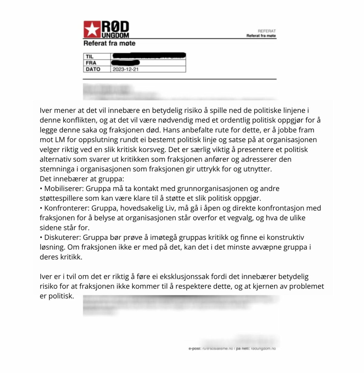 Då ho tok over som leiar fortel ho at ho fekk tilgang til leiar-PC-en og fann ei rekke ulike dokument, mellom anna eit møtereferat med råd frå ein som jobbar i Raudt.