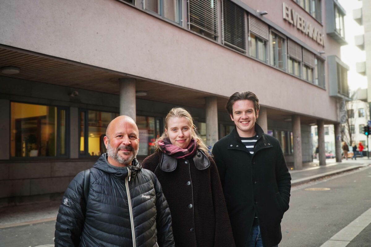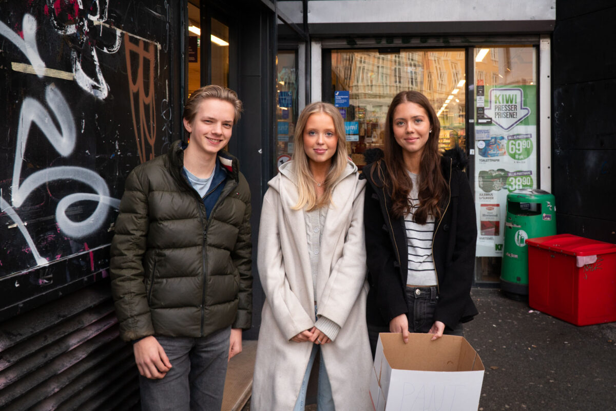 Framtida møter Elvebakken-elevane Eskil Ree Havnes (17), Cyan Fastvold (17) og Olivia Qvale-Hjertenes (17) utanfor Kiwi, den næraste butikken ved skulen.