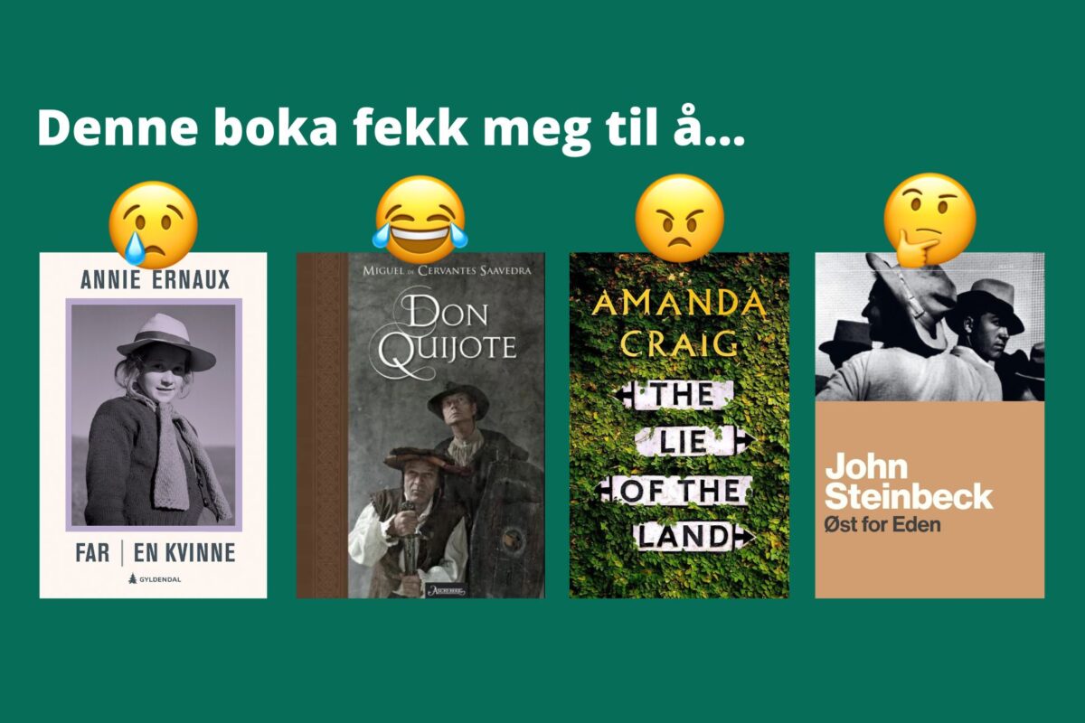 Lenger nede i saka kan du sjå kva bøker som har fått ho til å bli trist, le, bli sint og tenkje.