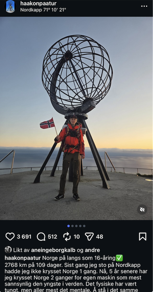 Ein annan av dei nominerte er Haakon Selnes Lorentzen (17), eller Haakon på tur på Instagram. Han gjekk frå Lindesnes til Nordkapp på 109 dagar i 2025, berre dagar før han vart 17 år.