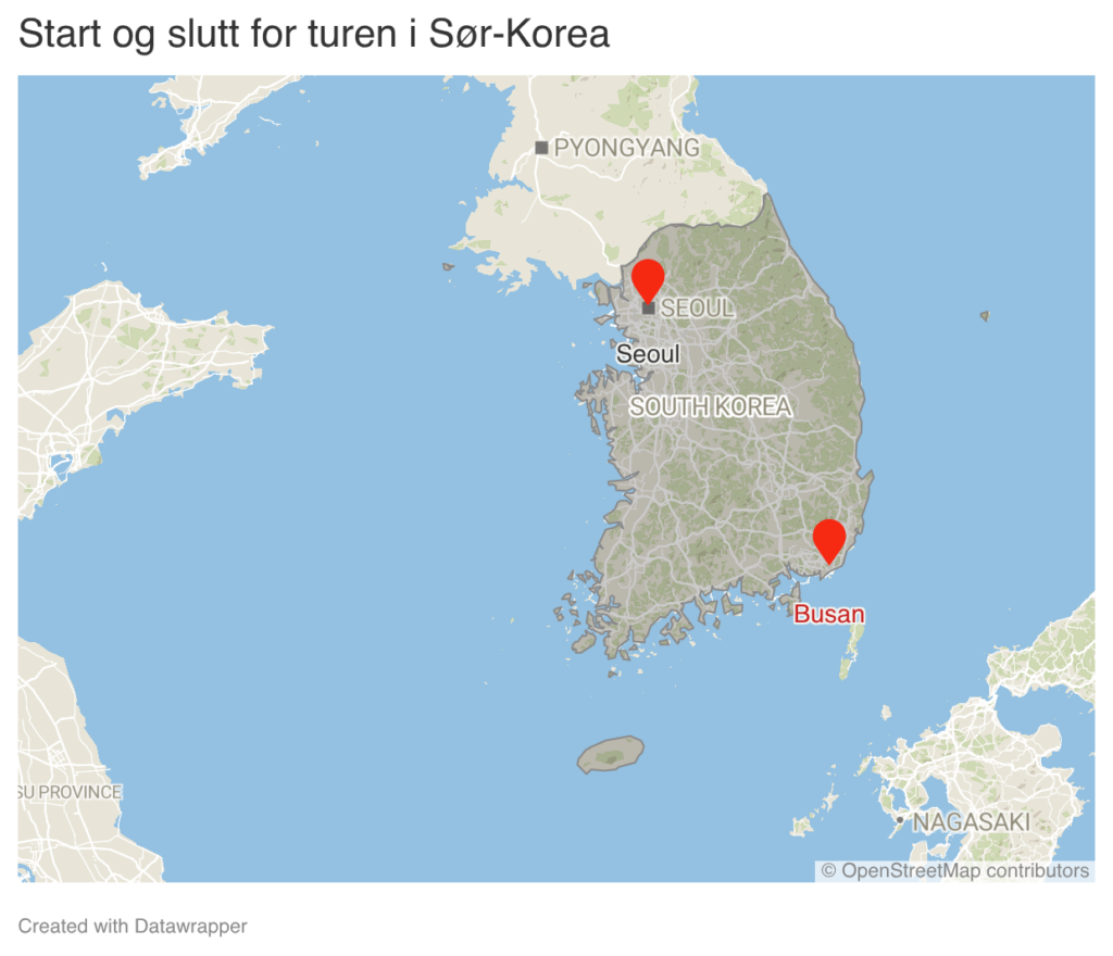 Det er eit stykke å gå frå Seoul i nord til Busan i sør.
