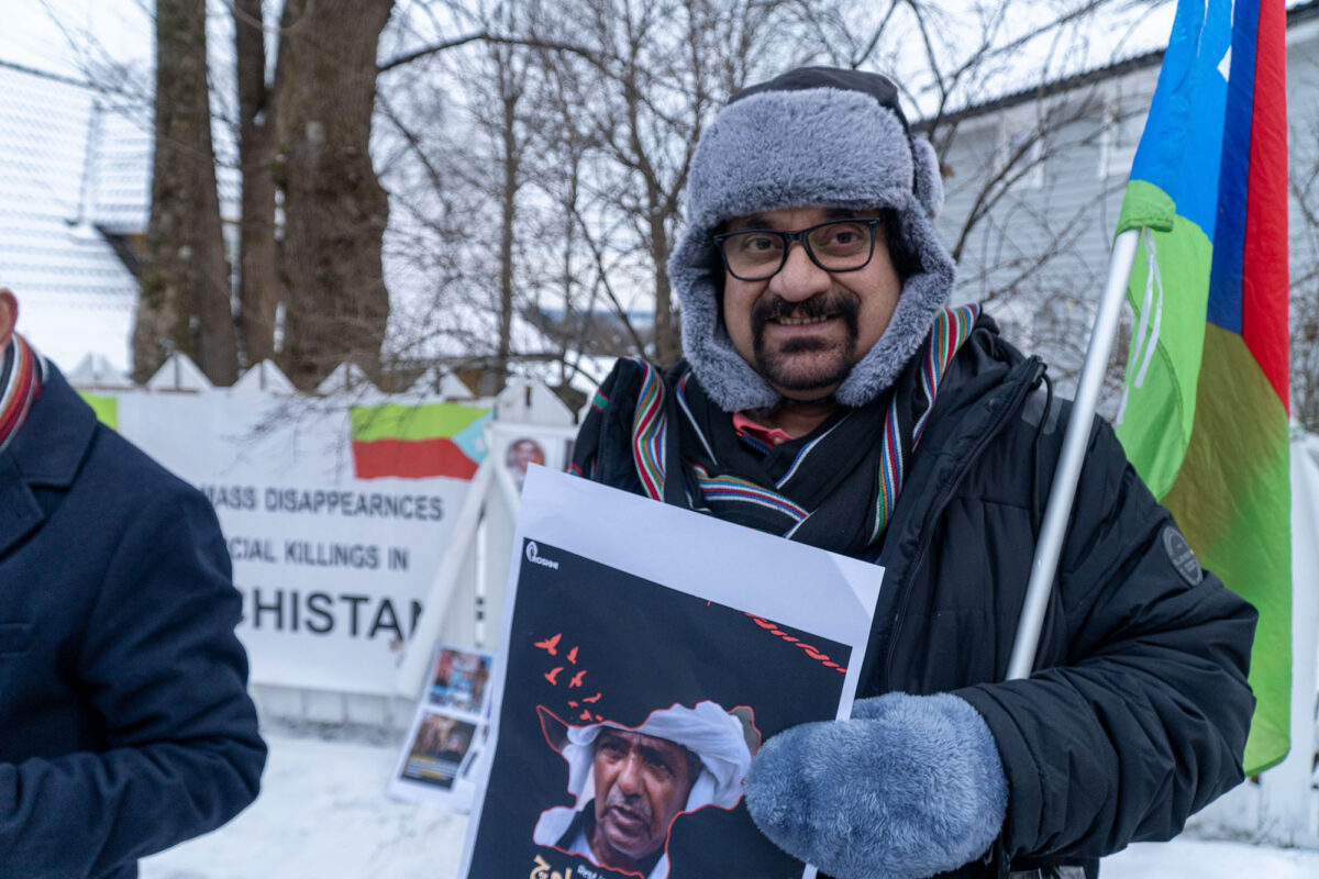 Medan Fearnley og Bergem er i møte inne på ambassaden, er det demonstrantar på den andre sida av gata. Dei har fått høyre om senatoren sitt besøk i Noreg, og held oppe flagg for Balutsjistan, ein region med ei sterk separatistrørsle, og bilete av sakna personar.