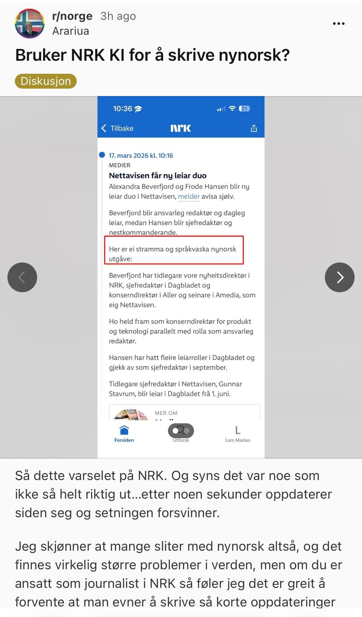Dagen før intervjuet, fekk Natvik i Målungdommen tilsendt eit innlegg frå Reddit, der ein brukar spør om NRK nyttar kunstig intelligens (KI) for å skrive nynorsk.