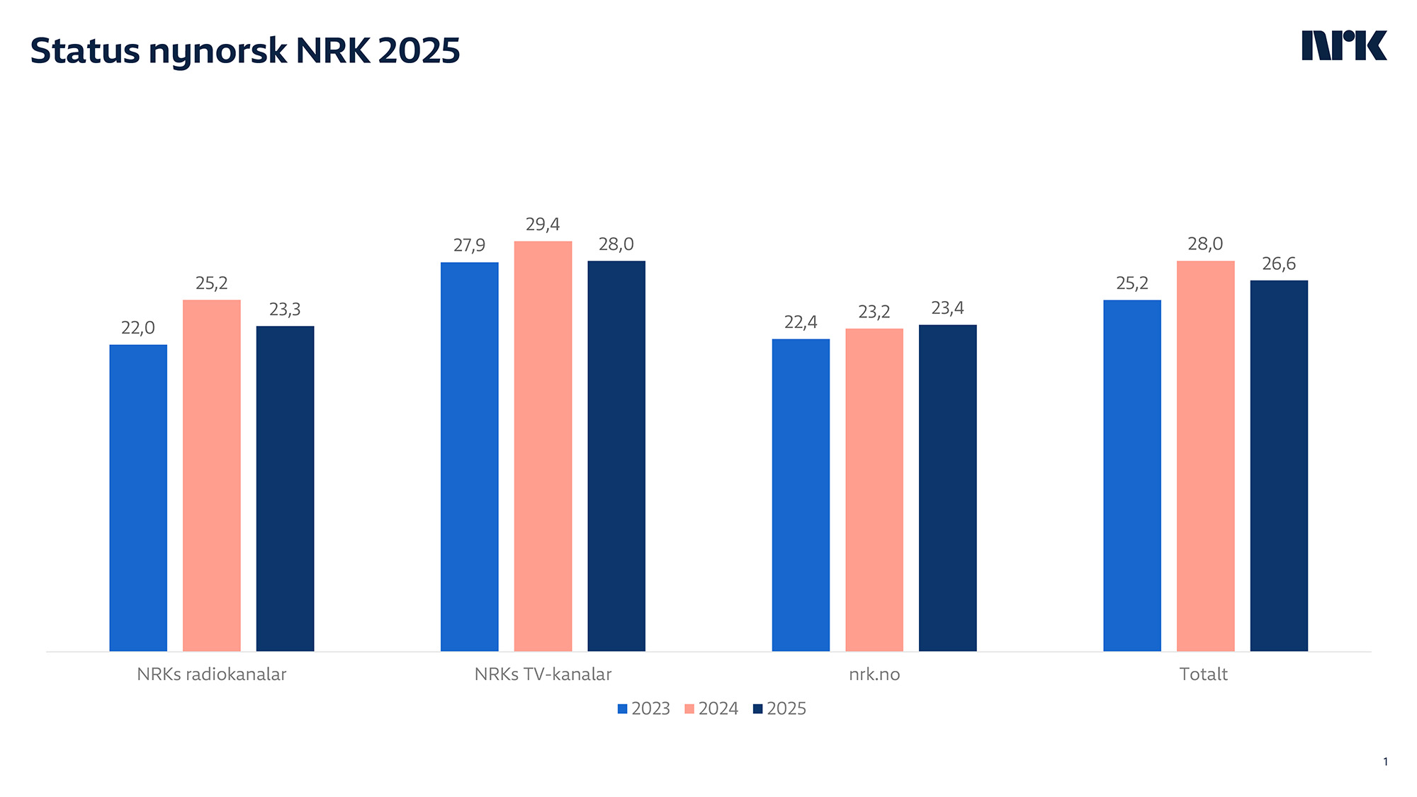 Totalt hadde NRK 26,6 prosent nynorsk på flatene sine i 2025, men kravet til NRK er at det skal vere minst 25 prosent nynorsk på kvar av dei tre plattformene TV, radio og nett.