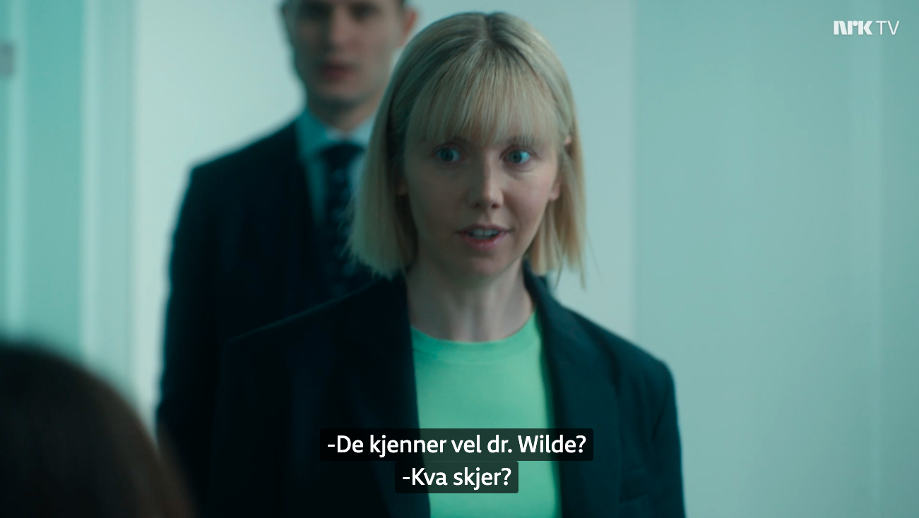 KVA SKJER? Framtida.no leita gjennom mange av dei store, norske produksjonane i NRK TV utan å finne teksting på nynorsk. Når det kom til britisk krim hadde vi større hell. Skjermbilete NRK TV.