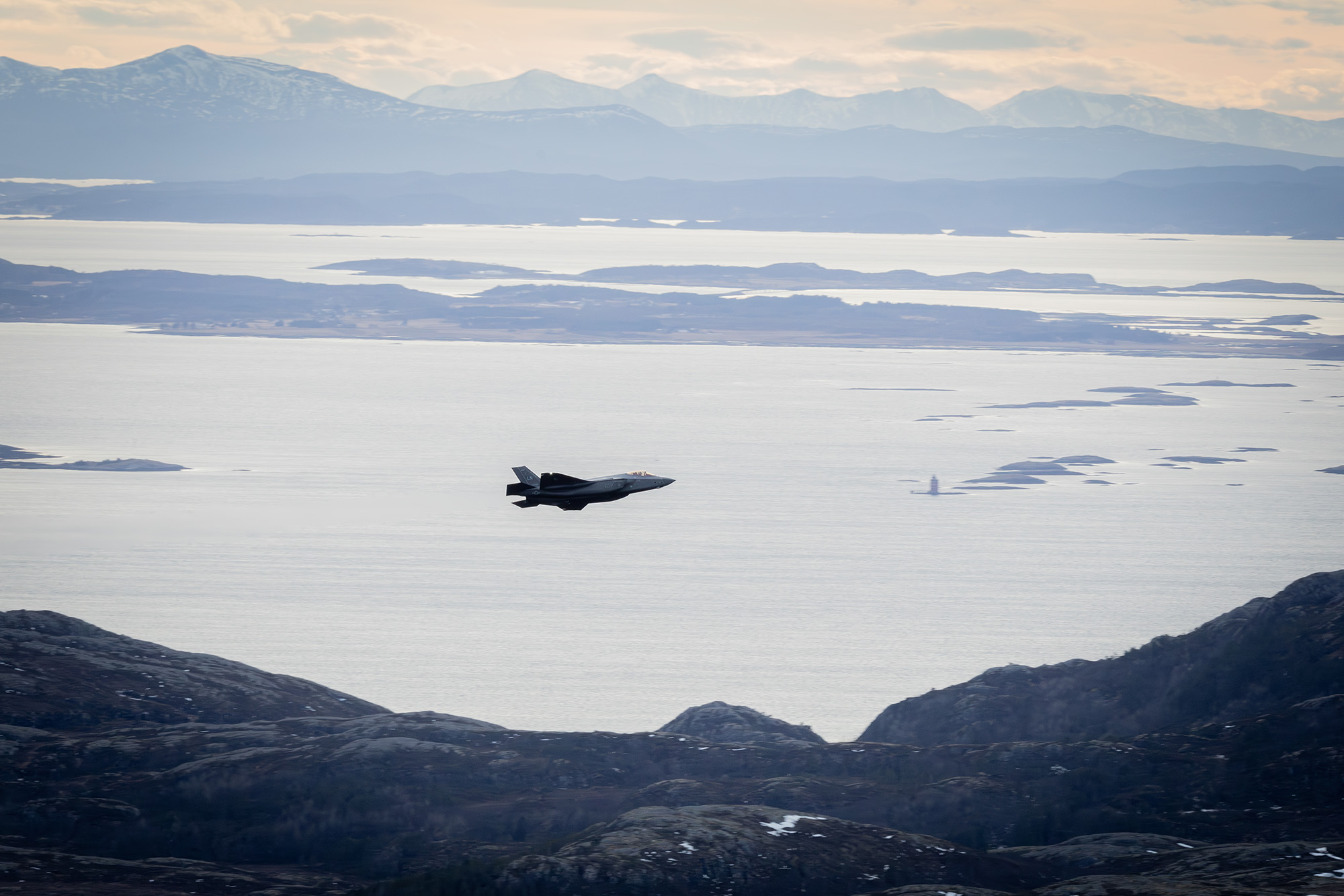 Eit amerikansk F-35A flyr lågt rundt Kopparen i Ørland under Nato-øvinga Cold Response 2026. Foto: Ole Andreas Vekve / Forsvaret