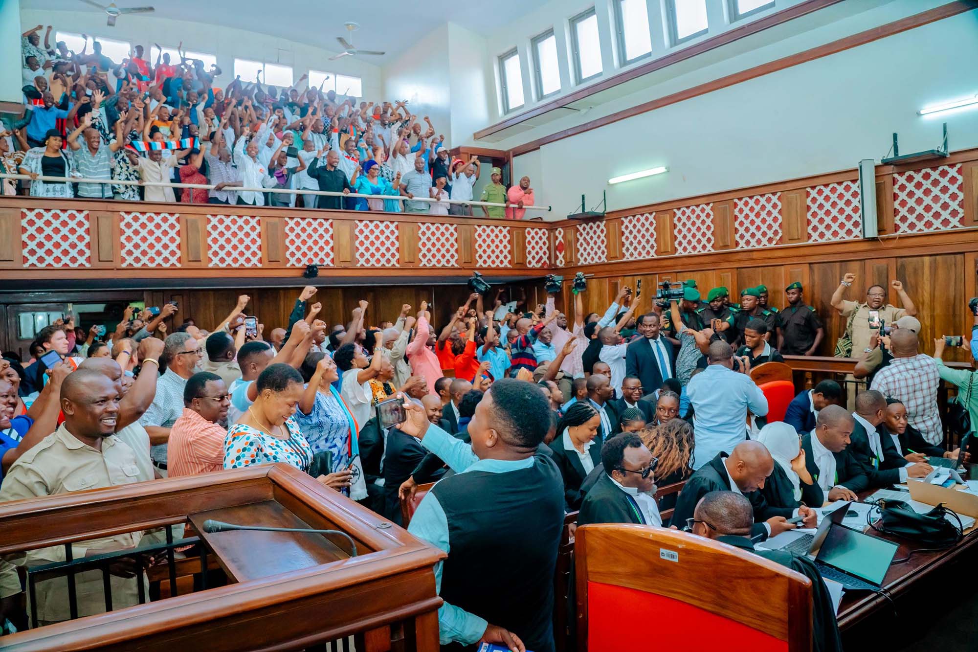 Opposisjonsleiar Tundu Lissu (til høgre) gestikulerer med tilhengarar i Tanzanias høgsterett under rettssaka måndag 9. februar 2026. Foto: AP Photo/Florence Majani
